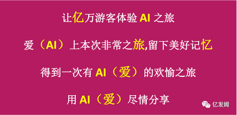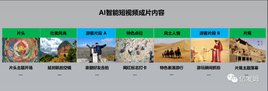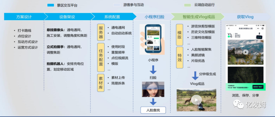 亿AI旅是一个AI交互视频数字文旅智慧平台,以微信小程序为载体,以AI视频数智交互系统为核心,游客在设置好的打卡点,按照指引进行拍照或录像,结合云端算法,即可获得个人专属旅行vlog。