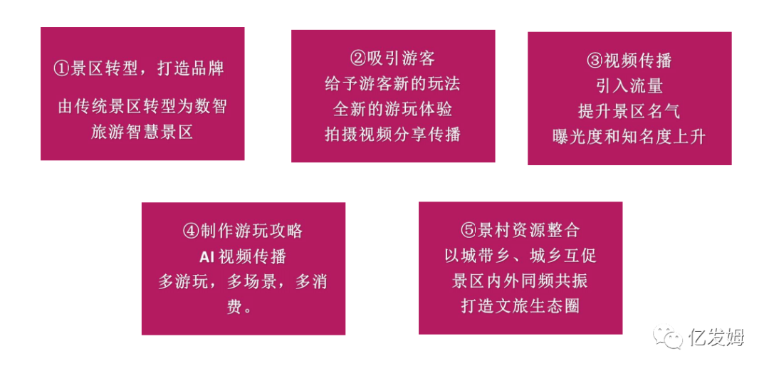 亿AI旅的研发是顺应乡村振兴战略,应用AI视频宣传新模式,整合乡村资源进行联动营销,赋予乡村传播增辐、宣传增效、游客增流、消费增值等新活力! 亿AI旅数智文旅平台简介
