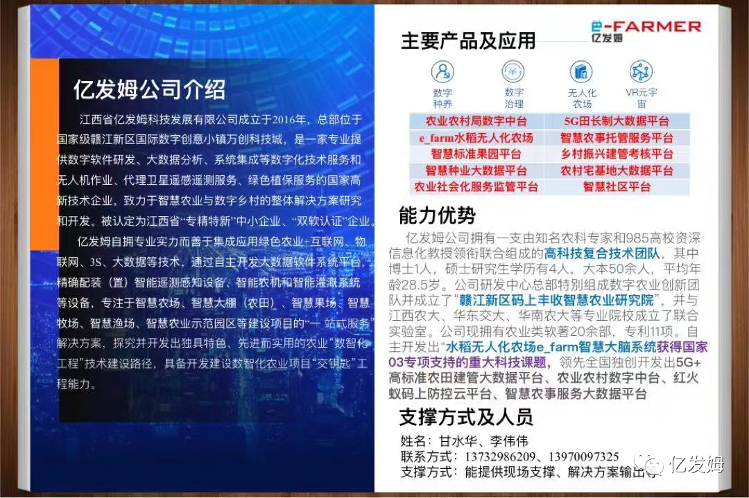 亿发姆紧随时代发展步伐,不断探索新技术、新领域,构建可持续发展模式,肩负着“用科技改变农业未来”的企业使命,亿发姆面向未来,坚持自主创新,以信息数字化赋能智慧农业和数字乡村建设,努力朝着“成为被人尊敬的数字科技企业”拼搏迈进!