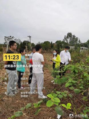 为摸清农业外来入侵物种情况,构建外来入侵物种信息数据库,分析外来入侵物种对经济、生态和社会的影响,研判外来物种入侵扩散趋势,为科学防控外来物种入侵提供基础数据支撑。受进贤县农业农村局委托,江西省亿发姆科技发展有限公司联合扬州大学植物保护学院植物病理研究团队,于2022年7月- 9月,开展农业外来入侵物种调查工作。